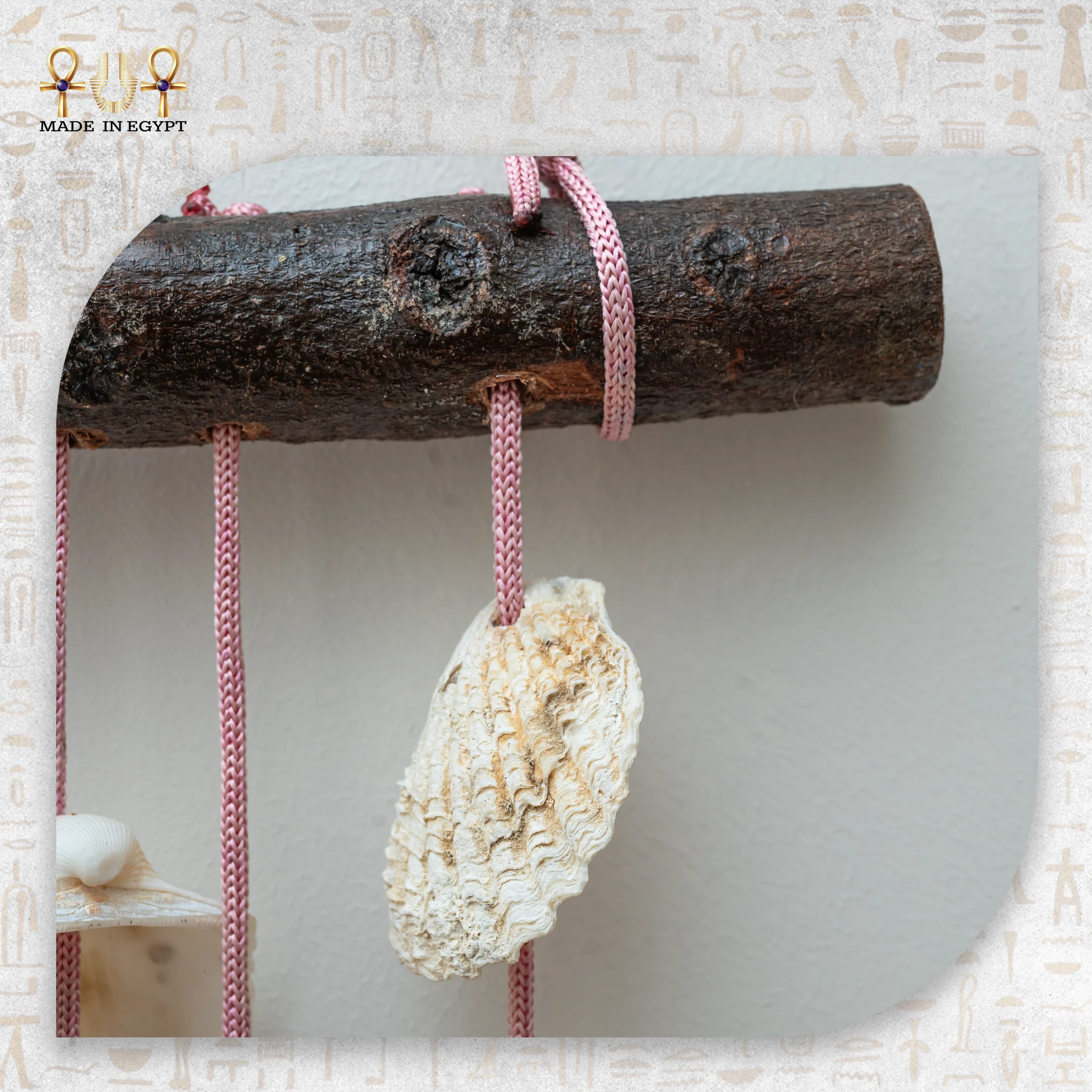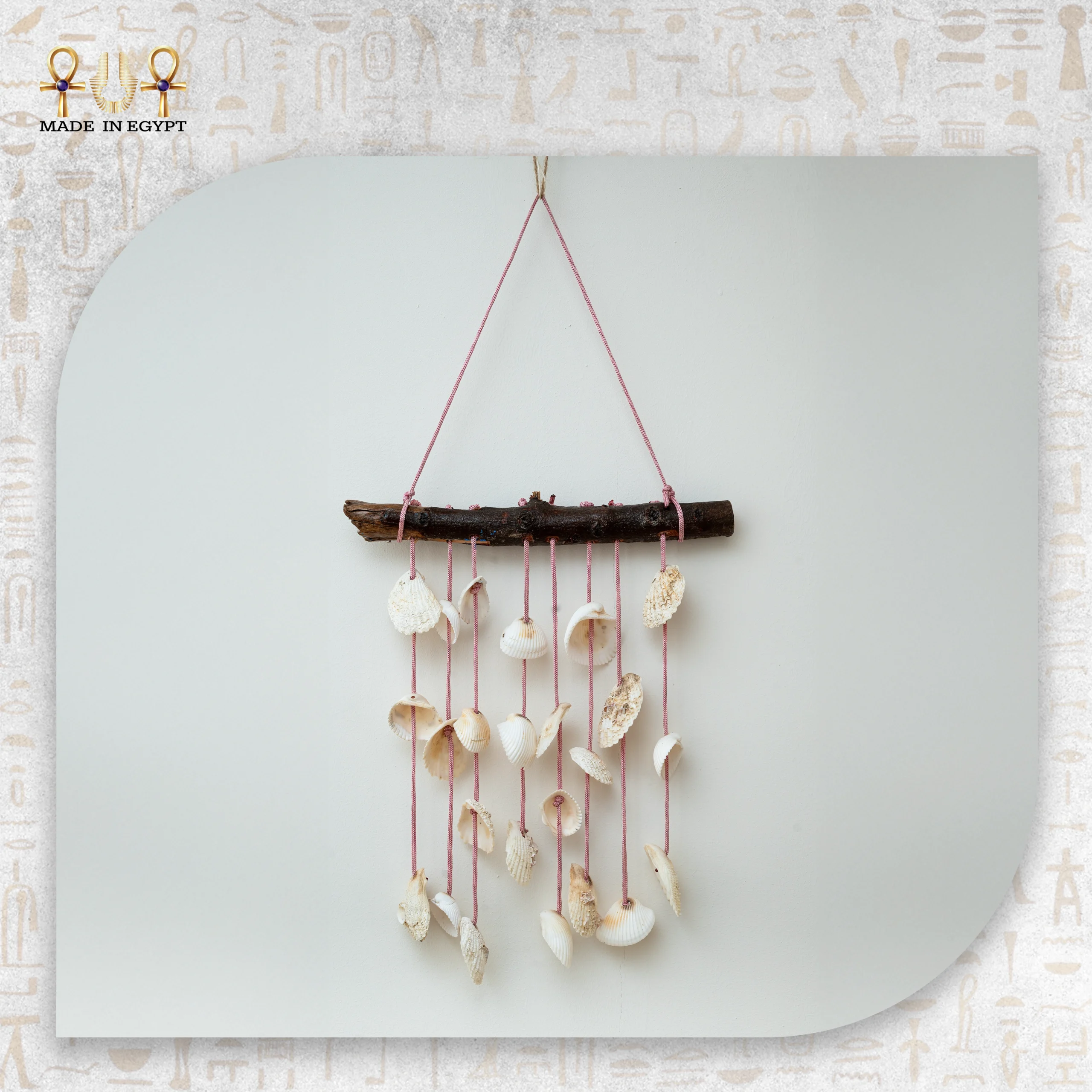 The light pink macrame cords add a soft and delicate contrast. They bring warmth and a subtle feminine touch to the design. This color combination creates harmony between the wooden branch and the shells without overpowering the overall look.