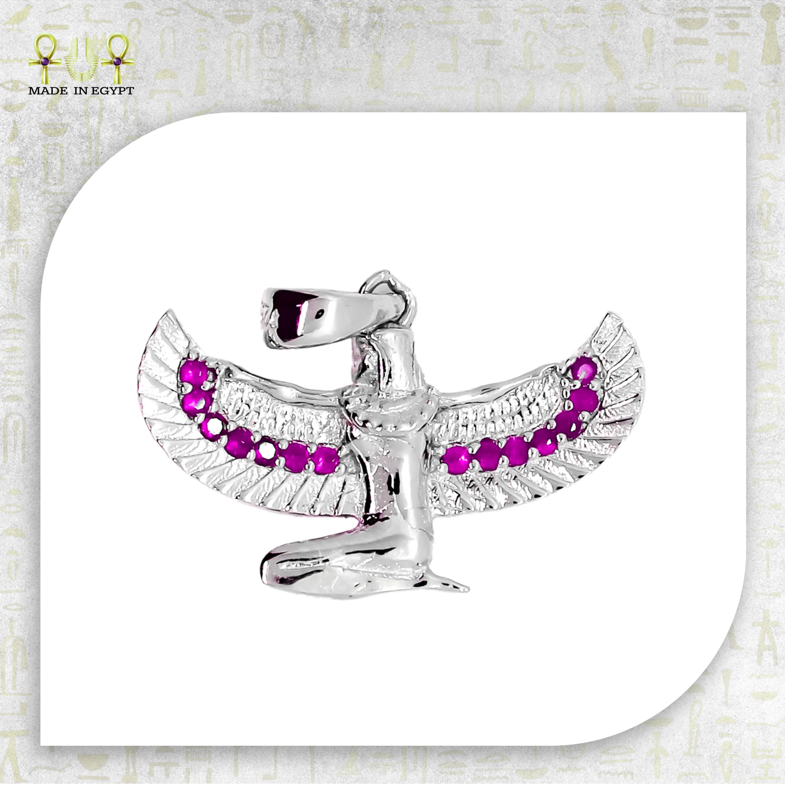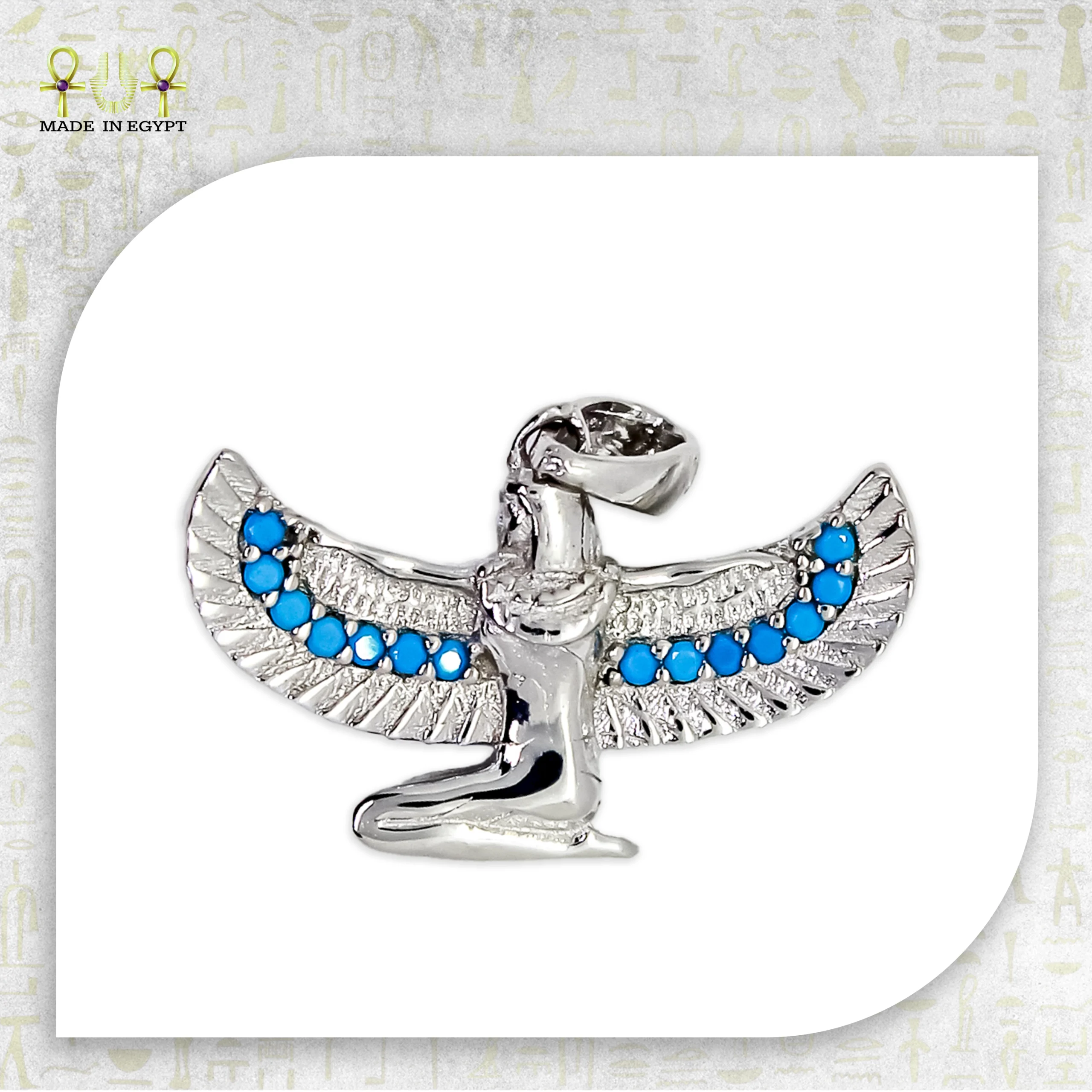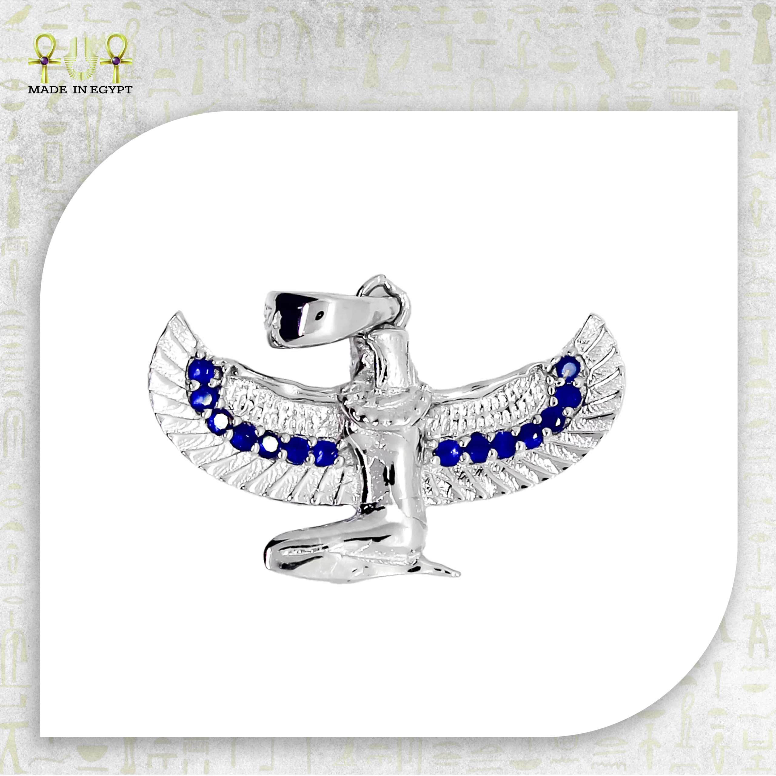 This pendant showcases Isis with her wings stretched wide in a stunning display of protection and spiritual energy. The design features polished silver-plated metal that shines with a soft, elegant glow. Deep blue stones accent the feathers, reflecting the colors of the Nile and the evening sky. In Egyptian symbolism, blue represents rebirth, wisdom, and truth — a perfect match for the energy of Isis.