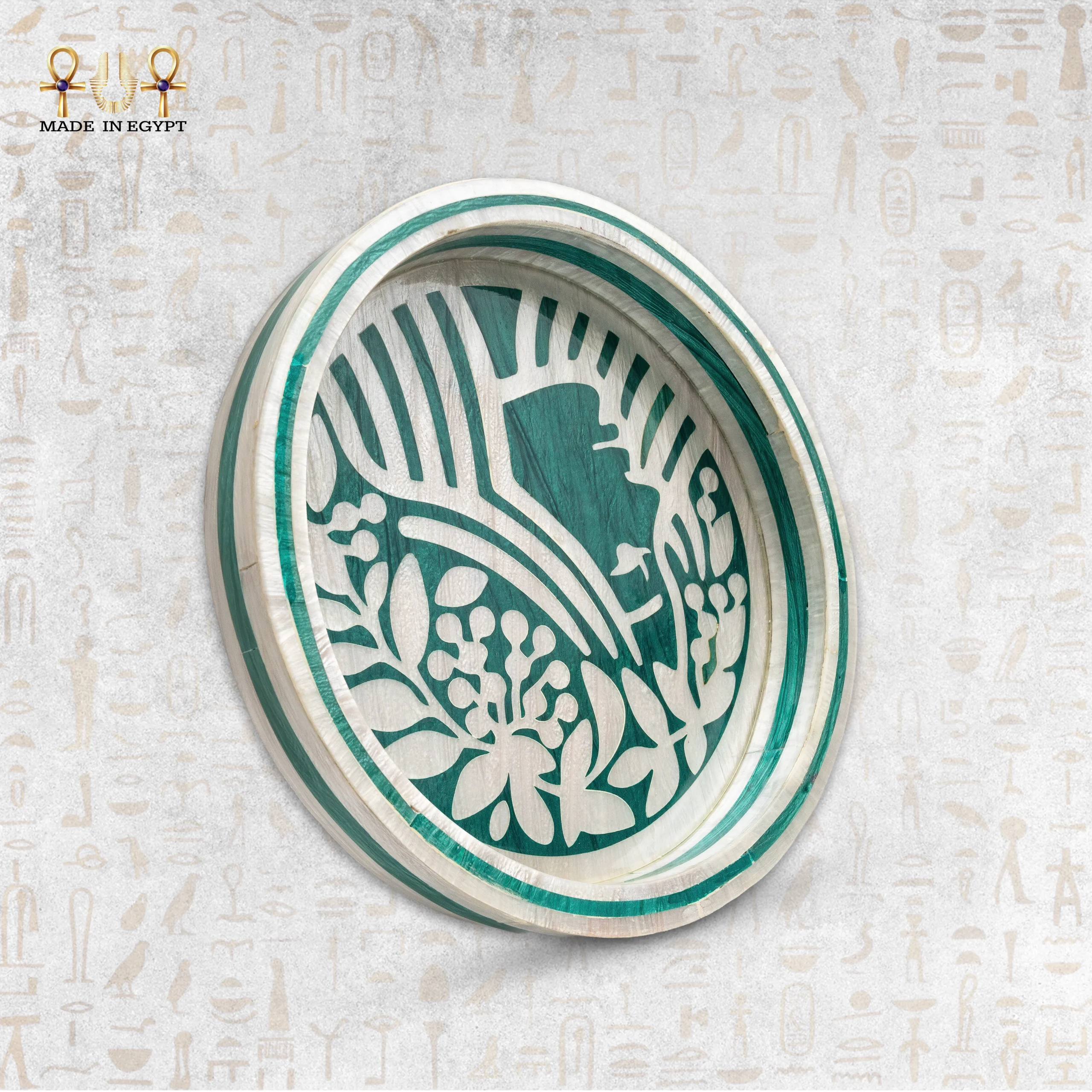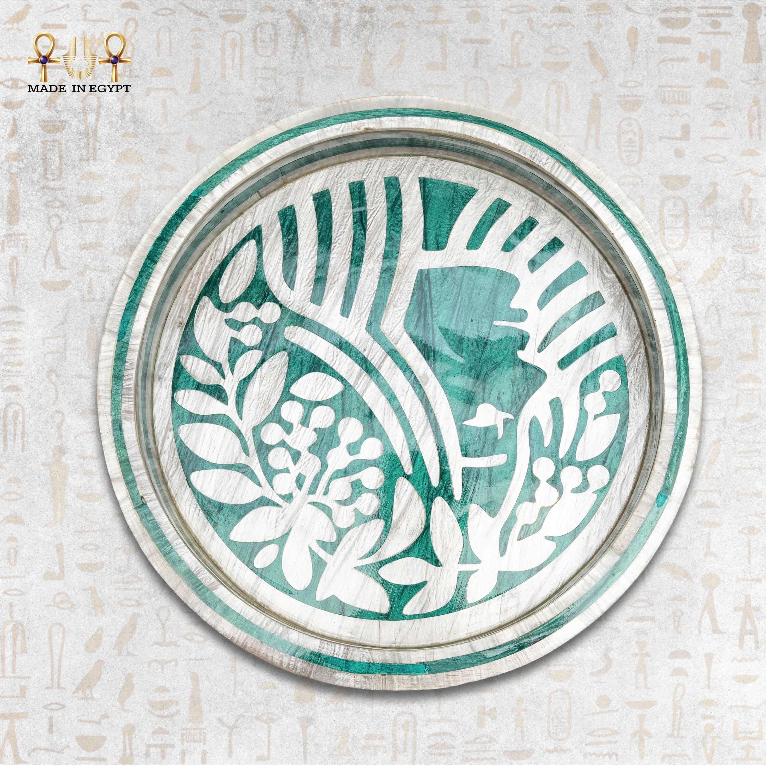 A handcrafted wooden serving tray with artistic inlay work, featuring a carved botanical pattern in a stylish light green shade. A refined, labor-intensive piece available in multiple sizes.