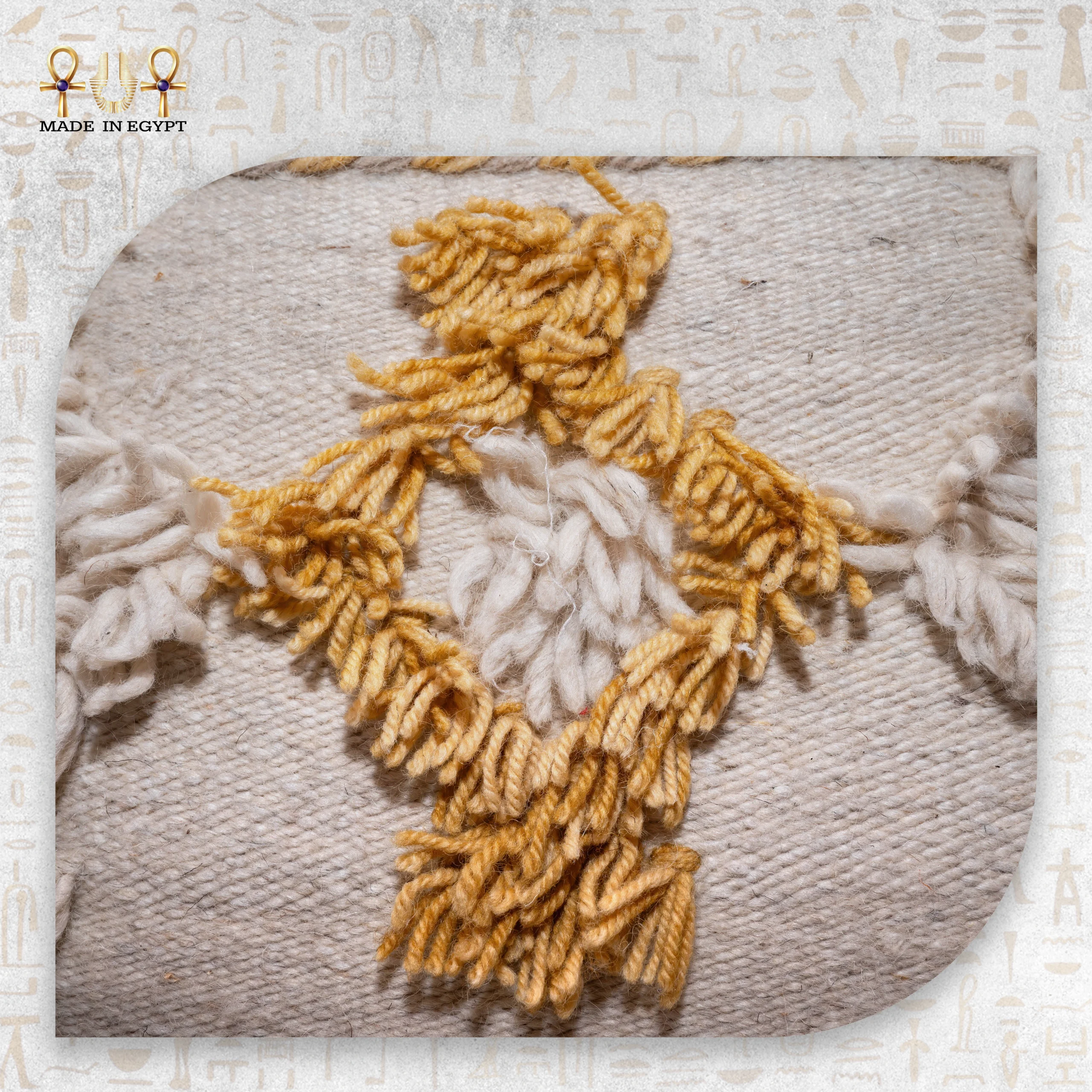 The Wool Glow Cushion brings warmth and elegance to any room through its handcrafted design and sun-inspired colors. Skilled Egyptian artisans weave it entirely by hand using pure natural wool. They combine soft beige and cream threads with golden yellow tones that reflect the gentle glow of the Egyptian sun. These woven layers form a raised texture that adds visual depth and a rich, tactile feel.