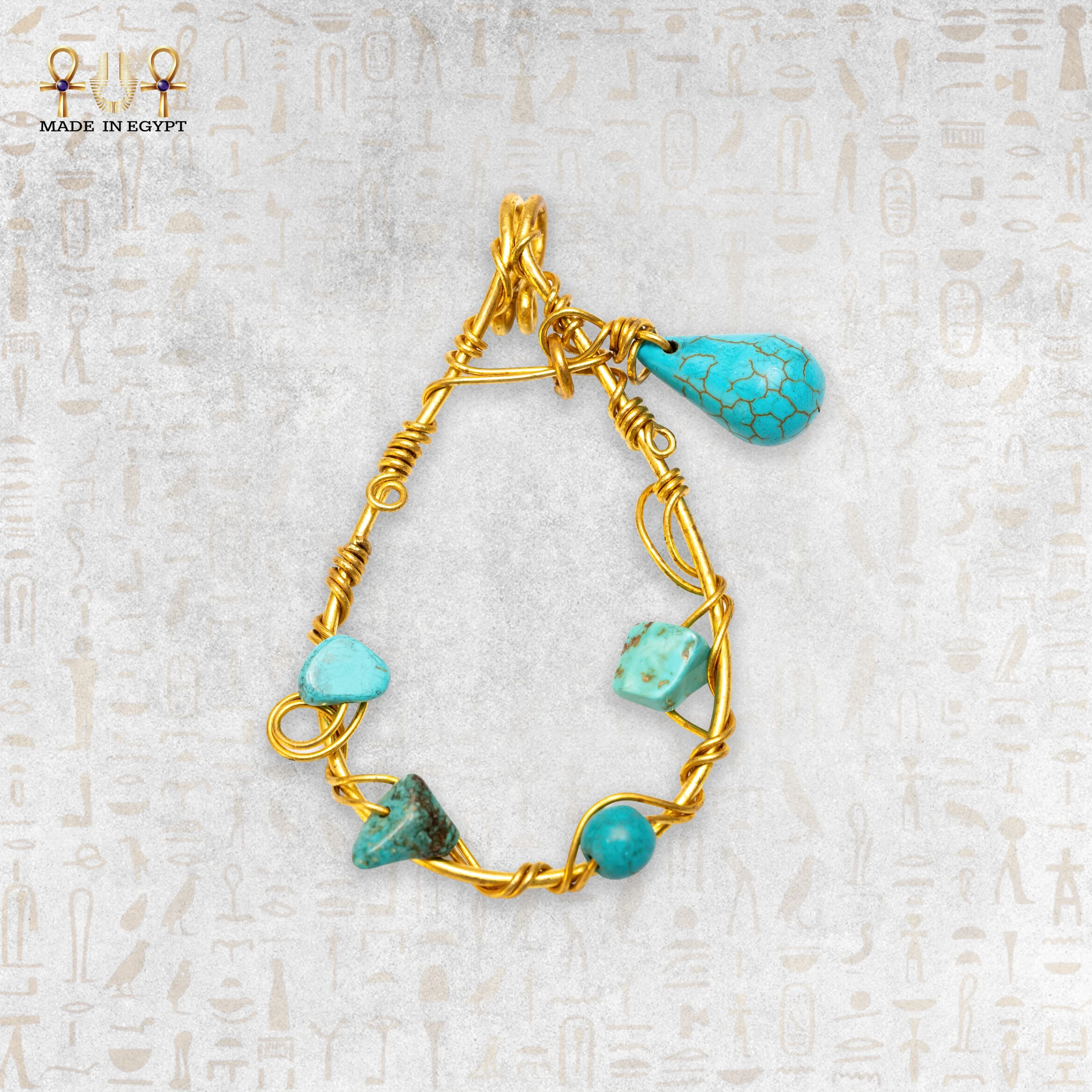 Handcrafted yellow brass wire pendant adorned with natural turquoise stones, an artistic heritage-inspired design symbolizing protection and positive energy.