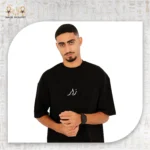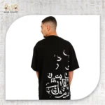 Available in two sophisticated shades — deep petrol blue and classic black — each color features a unique contrast print that enhances its visual appeal. The black tee highlights crisp white calligraphy for a sharp, minimalist look, while the petrol blue version features sleek black print for understated elegance. Whether paired with jeans, cargo pants, or skirts, this tee adds an artistic edge to any outfit.
