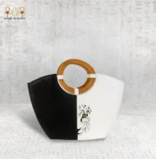 $249.07A genuine Egyptian leather handbag featuring a bold black and off-white contrast with a hand-painted leopard eye design. A powerful artistic statement with a natural wooden handle.