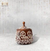 $14.00A handcrafted wooden vessel in a rich dark tone, decorated with hand-painted Eastern motifs that reflect authenticity and dignity. Finished with a practical lid and a simple top knob, it can be used as a decorative accent or for storing small items, adding a calm and elegant touch to any space.