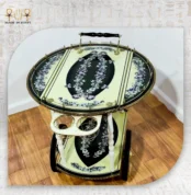$682.06A luxurious marquetry serving cart in elegant off-white with brass inlay, made from Banoh wood and coated with water-resistant resin. Easy to move and available in round and rectangular tray designs.