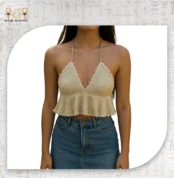 $108.87A chic bohemian crochet top with thin straps, a deep V-neck, and a ruffled hem. Lightweight and breathable, perfect for summer days, beach vibes, and free-spirited boho style.