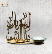 $9.07A golden MDF wooden incense holder with a rust-resistant metal bowl, featuring the phrase “Allahumma Barik Hatha Al-Bayt” Customizable with any logo or phrase — a blend of faith, art, and elegance for modern homes.